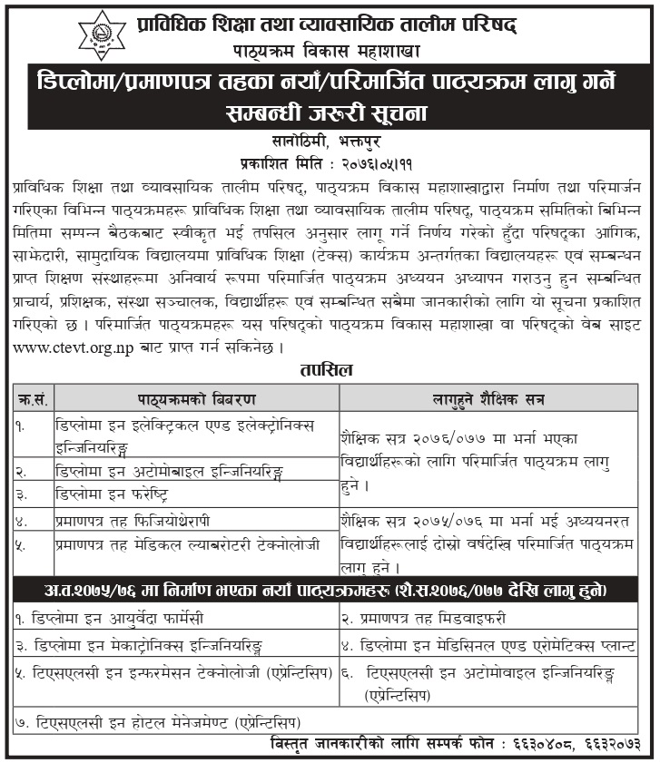 Council for Education and Vocational Training Council (CTEVT), Curriculum Development Division has approved various courses of Council for technical education and vocational training, curriculum committee, and decided to apply according to the details of technical education in Textile, Partnership, Community School. Under the program, This information has been published in the schools and affiliated teaching institutes for the purpose of teaching the modified curriculum study to the concerned principals, instructors, institution operators, students and all concerned. Modified courses may be obtained from the Council's Curriculum Development Division or the Council's Web site at www.ctevt.org.np.