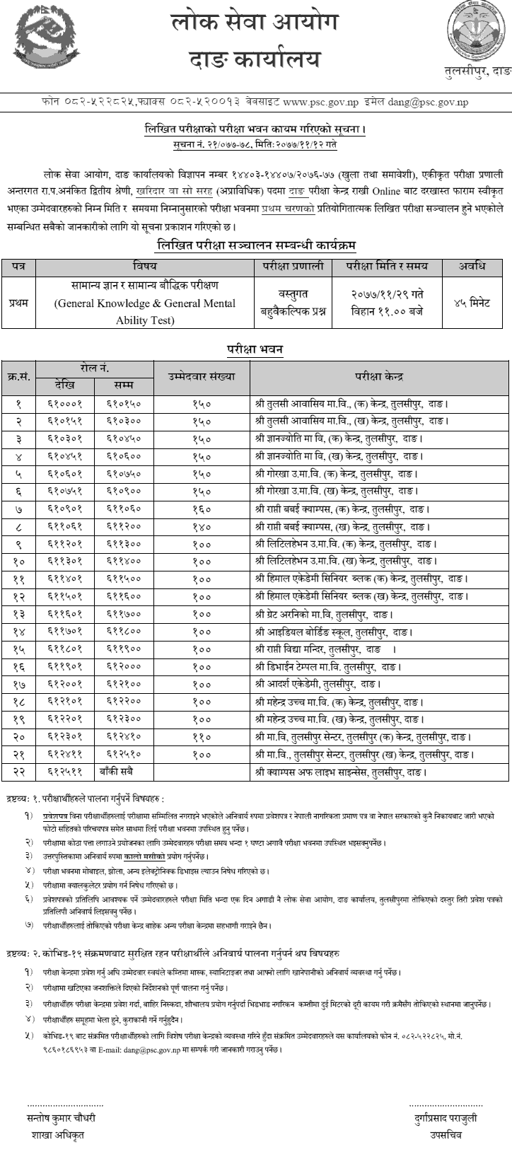 Public Service Commission, Dang Office Advertisement No. 14403-14407 / 076-77 (Open, Inclusive) (Joint and Unified), Non-Gazetted Second Class, Kharidar or similar post, Dang Examination Center Examination. The written examination will be conducted on the 29th of Falgun 2077, at 11 AM ( General Knowledge and Mental Ability Test for 45 minutes).
