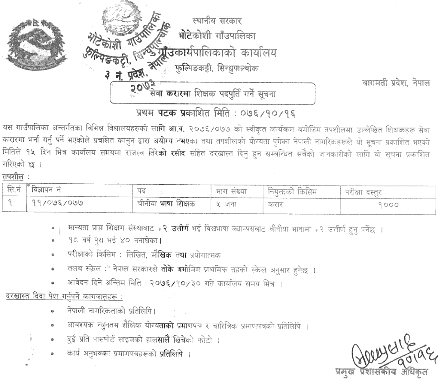 Nepalese citizens, who were disqualified by the prevailing laws and qualified for details, were required to be admitted to the teachers' service agreement as specified in the program approved by the fiscal year 2076/077 for various schools under Bhotekoshi Gaupalika, Phupingkatti, Sindhupalchwok. For all information regarding filing an application including paid receipt Information has been published.