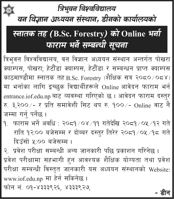 Tribhuvan University, Institute of Forestry, Dean's Office Notice Regarding Online Admission Form for Bachelor's Degree (B.Sc. Forestry)