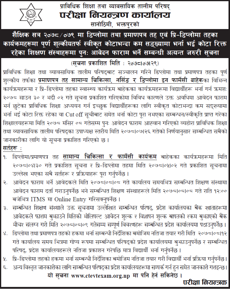 Council for Technical Education and Vocational Training (CTEVT), Examination Control Office, Sanothimi, Bhaktapur Urgent notice regarding re-application form in the educational institutions where the quota is vacant in the academic session 2078/079 by enrolling in less than the sanctioned quota towards full fee in diploma and certificate level and pre-diploma level programs.