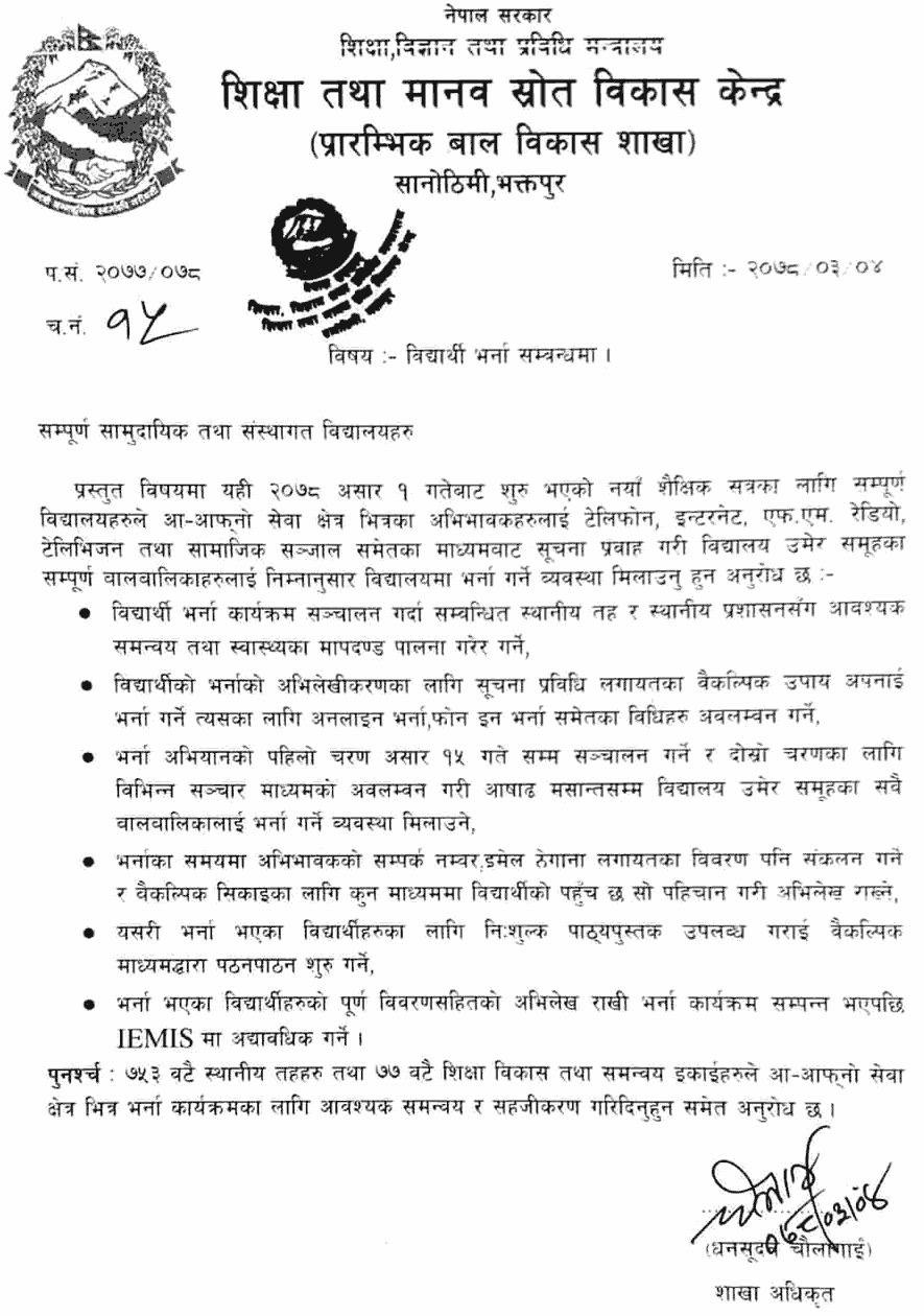 Government of Nepal, Ministry of Education, Science and Technology, Center for Education and Human Resource Development, (Early Child Development Branch), Sanothimi, Bhaktapur notice to start students enrollment program in the community and institutional schools