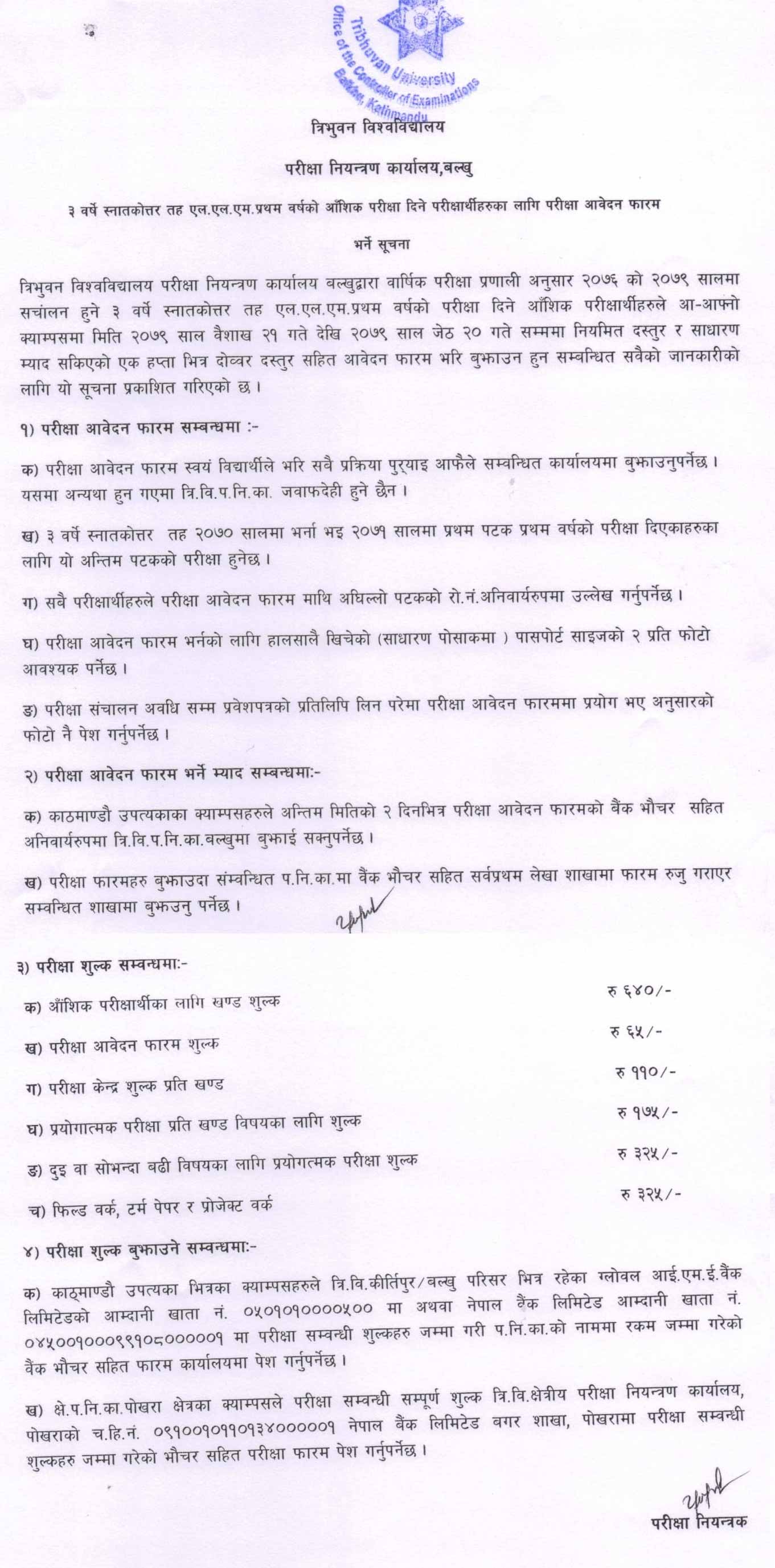 Tribhuvan University, Examination Control Office, Balkhu Notice to fill the examination application form for the candidates appearing for the 3-year post-graduate level LLM first year partial examination.