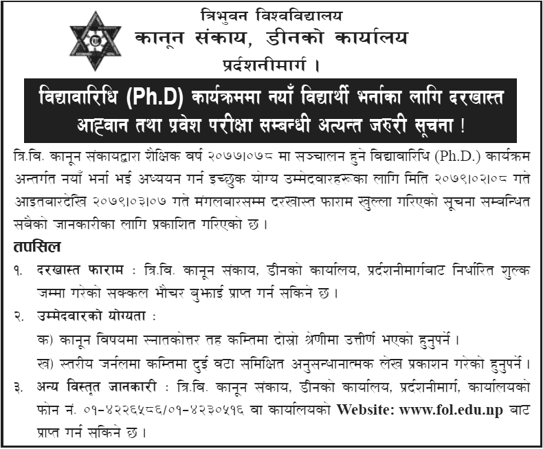 Tribhuvan University, Faculty of Law, Dean's Office, Exhibition Road Urgent notice regarding application and admission test for admission of new students in the Ph.D. program