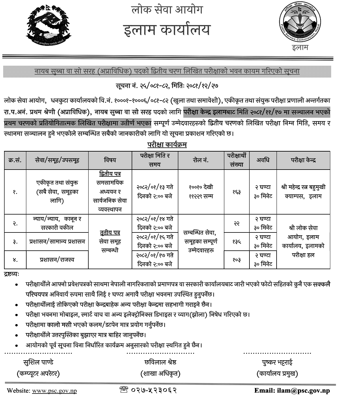 Public Service Commission, Ilam Office – Exam Center Allocation Notice, Advertisement No. 10001–10006/081–82 (Open and Inclusive), Nayab Subba or Equivalent, Non-Gazetted First Class (Non-Technical).