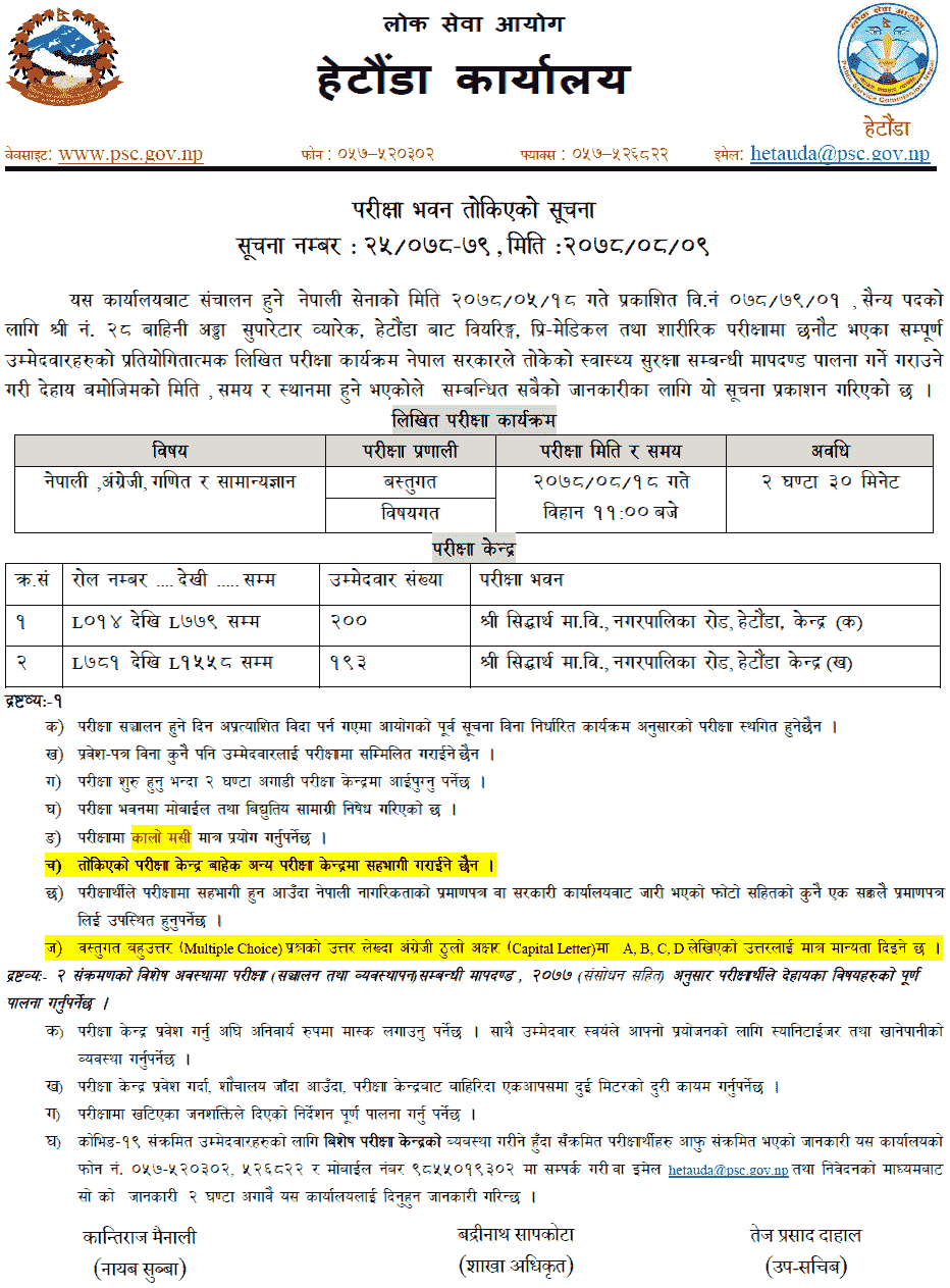 Nepal Army Sainya Post Written Exam Center Hetauda and Chitwan: Public Service Commission, Hetauda office Advertisement No. 078/79/01 of Nepal Army Notice of establishment of written examination hall for the candidates selected for the written examination from Shri Kali Bahadur Gana, Bharatpur Barracks, Chitwan.