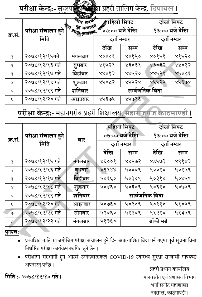 As per the advertisement published by the Police Headquarters on 2078-08-10, the preliminary health examination and physical fitness examination of the candidates will be conducted in the following examination centers as per the schedule below. Candidates appearing for the examination should be present at the designated place 1 (one) hour before the commencement of the examination along with the original citizenship certificate and the entry form provided by the concerned office; This information has been published for the information of the concerned candidates.