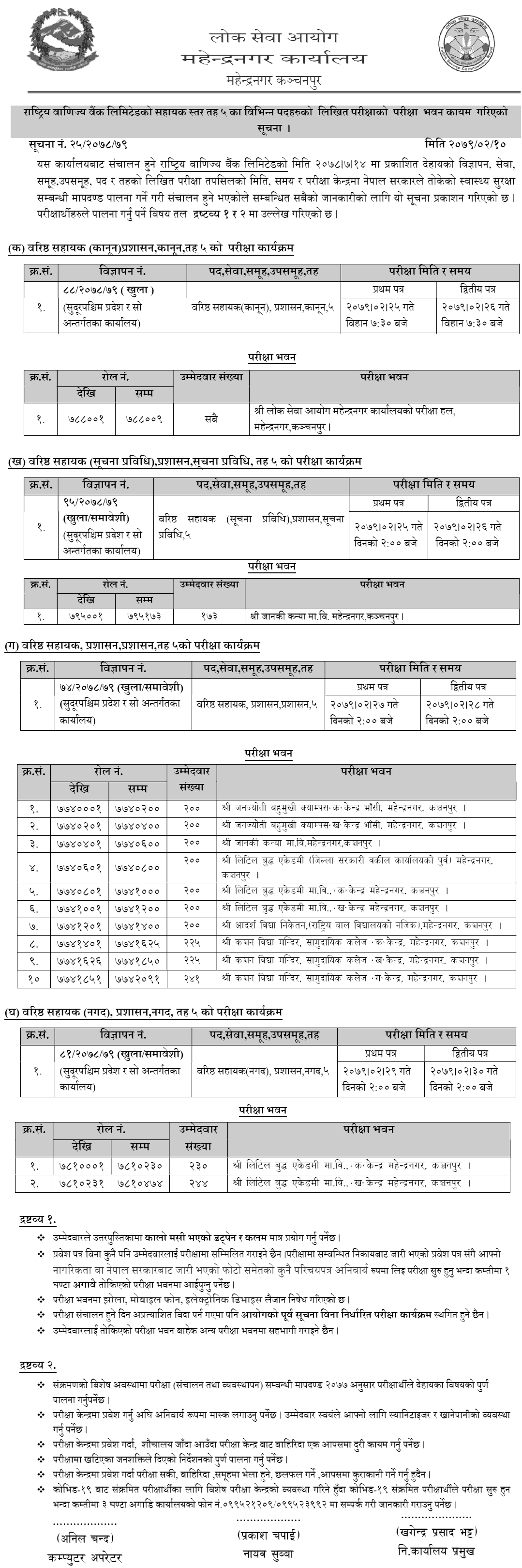Rastriya Banijya Bank Limited 5th Assistant Level Various Position Written Exam Center Mahendranagar: Rastriya Banijya Bank Limited (Sudurpashchim Province and its subordinate offices) Level-5 Advertisement No. 88/2078/79, 95/2078/79, 74/2078/79, 81/2078/79 for the written examination of various posts Operated by Public Service Commission Mahendranagar Office.