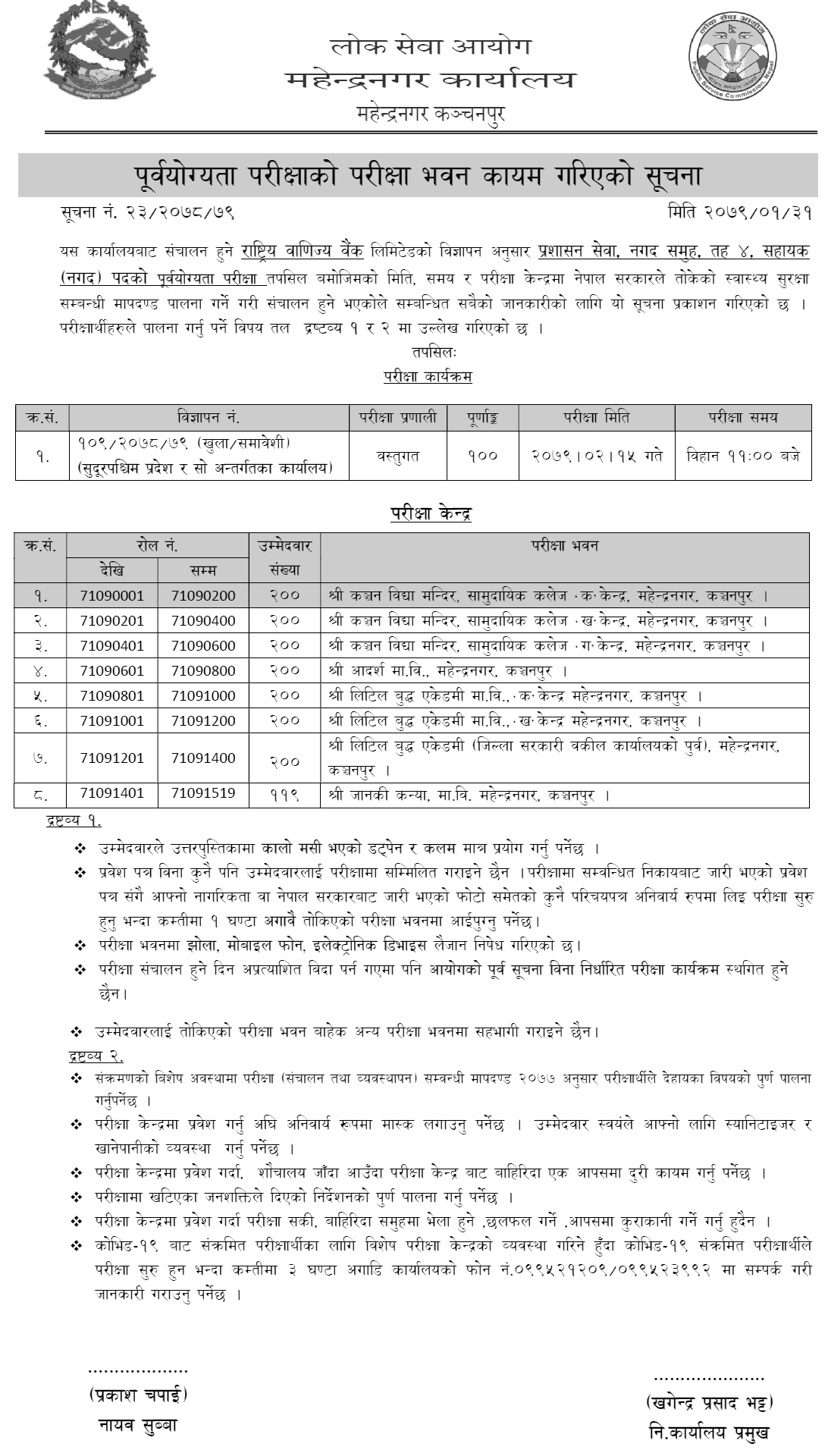 Advertisement No. 102/078/79 of Rastriya Banijya Bank Limited operated by Public Service Commission Mahendranagar Office; Notice of establishment of examination building for pre-qualification examination for administration, administration, level 4 assistant post.
