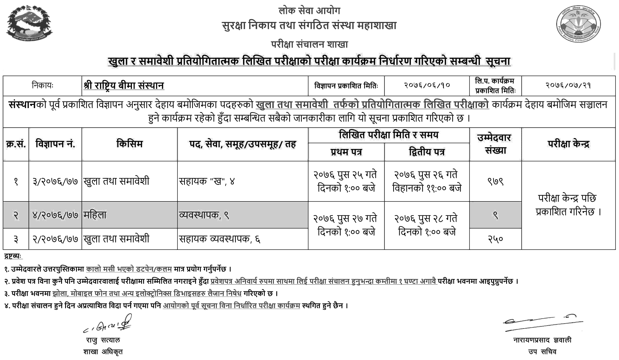 Lok Sewa Aayog (Public Service Commission - PSC), Anamnagar, Kathmandu has published the Examination Schedule of Rastriya Beema Sansthan for various Positions. The Written examination will be conducted from 2076 Poush 25 (11:00 AM).