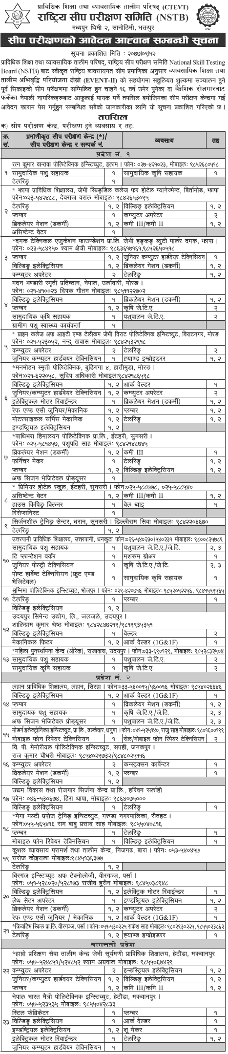 15) For more information, please call 01-6638153, 01-6635195, 98511127080, and 9851163964. This notice can also be viewed on the National Skills Testing Committee website www.nstb.org.np and the event project website www.event.gov.np