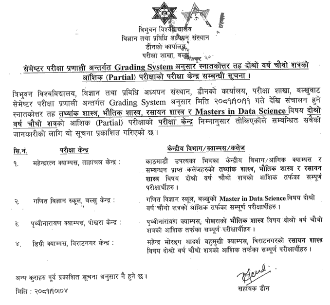 Tribhuvan University, Institute of Science and Technology, Office of the Dean, Examination Section, Balkhu, Kathmandu Notice Regarding Examination Centers for the Partial Examinations of the Second Year, Fourth Semester, of Master's Level (MSc) Programs Under the Semester Examination System with Grading System.