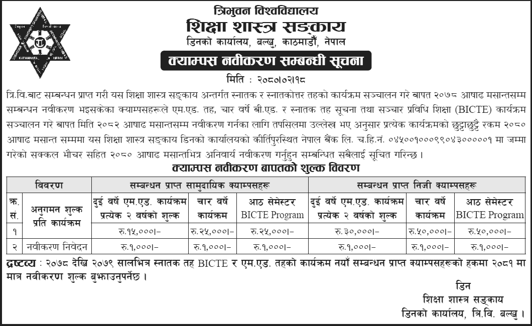The Faculty of Education at Tribhuvan University, located in Balkhu, Kathmandu, Nepal, hereby notifies all concerned parties regarding the campus renovation renewal process. The following information and fees apply: