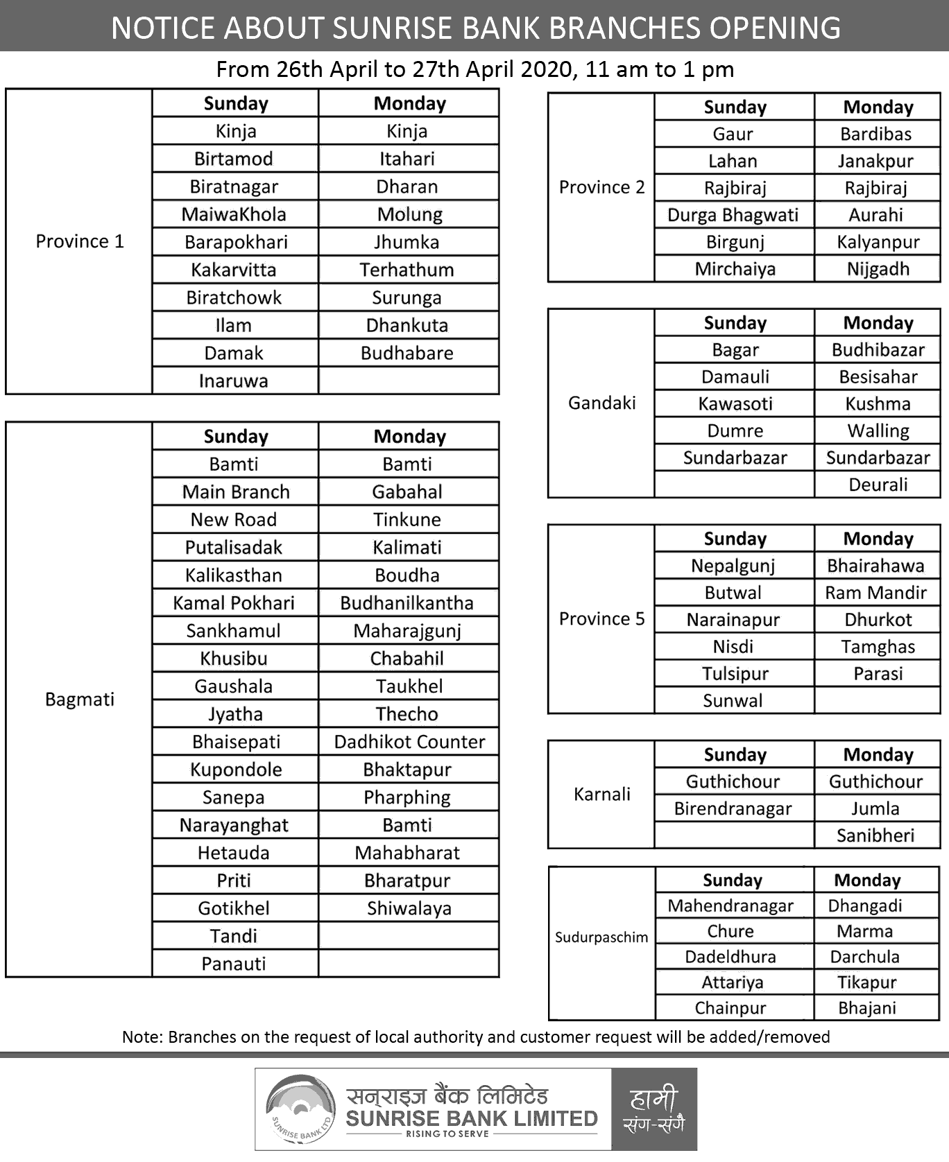 While supporting Nepal Government's call for nationwide lock-down, we remain committed in our endeavor to provide only essential banking services to our customers from the following branches from 10:00 AM to 1:00 PM;