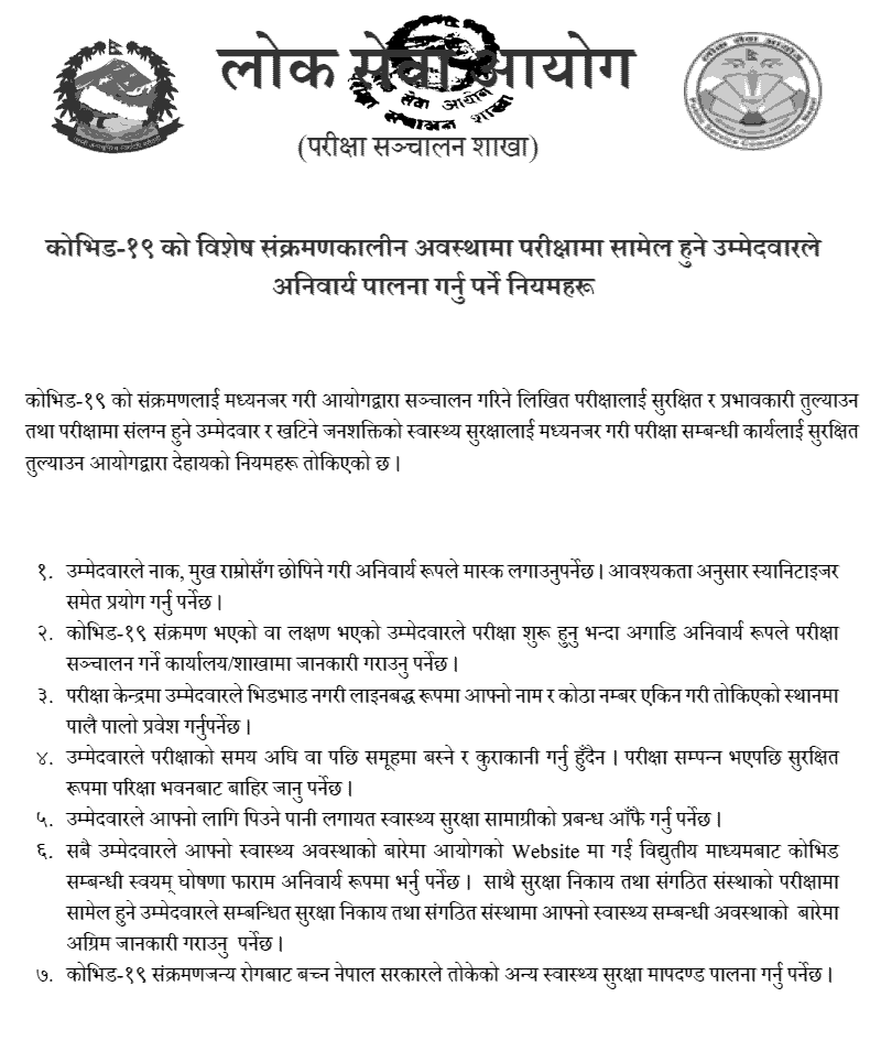 6) All the candidates will have to go to the website of the Commission about their health condition and fill up the self-declaration form related to COVID electronically. In addition, the candidate appearing for the examination of the security body and the organization will have to inform the concerned security body and the organization about his / her health condition in advance.