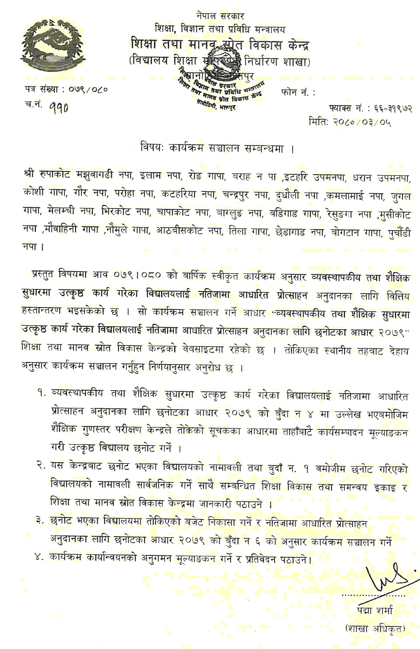 The financial assistance will be monitored at the local level to ensure the proper utilization of funds. Chudamani Paudel, the Director General of the Center for Education and Human Resource Development, confirmed that the five lakh rupees grant would be provided to each recognized school of excellence.