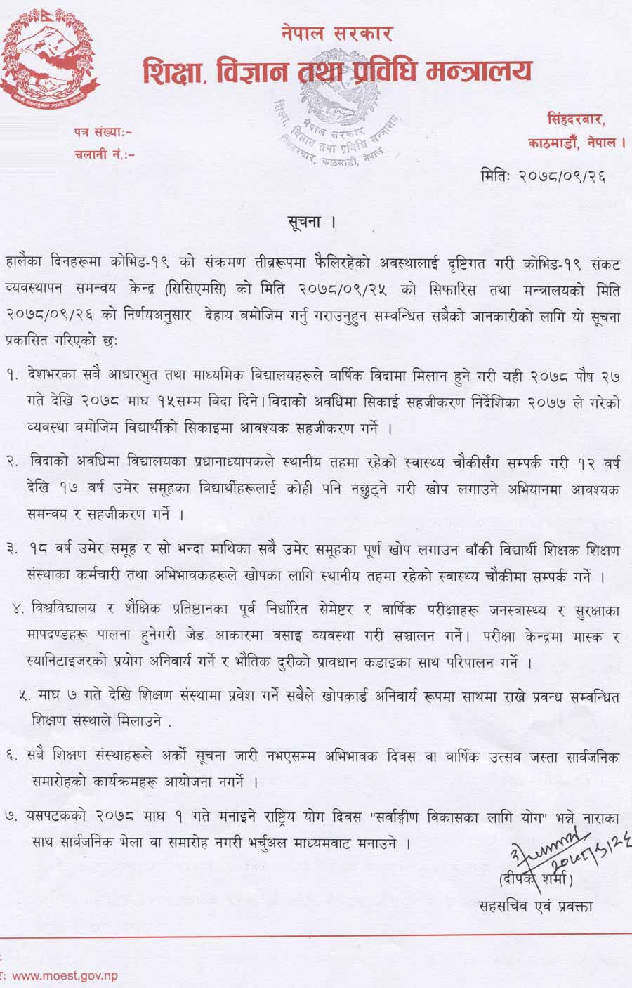 1) All the basic and secondary schools across the country will be given leave from the 27th of Poush 2078 to the 15th of Magh 2078 so that the annual leave will be matched. Necessary facilitation in the learning of students as per the provision made in the Learning Facilitation Directive 2077 during the leave period.