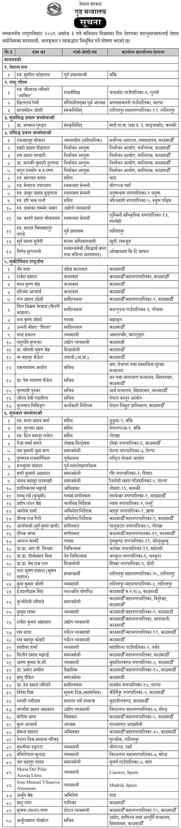 Name List of Awardees on the Occasion of Constitution Day 2079: The government of Nepal, the Ministry of Home Affairs (MoHA) published a name list of various honors and awards on Constitution Day 2079. The various honor and awards will be distributed by President Bidhya Devi Bhandari on the occasion of Constitution Day celebrates on 2079 Ashoj 3 (19th September 2021). Please find the name of the honors and awards in the following list.
