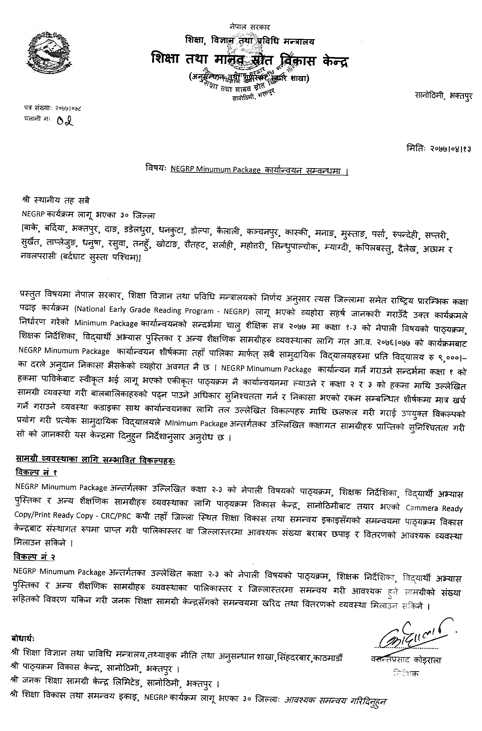 In this regard, as per the decision of the Government of Nepal, Ministry of Education, Science, and Technology, the National Early Grade Reading Program (NEGRP) has been implemented in the district as well. In the session 2077, it is aware of the fact that the grant has been disbursed at the rate of Rs. 9000/- Regarding the implementation of NEGRP Minimum Package, to implement the integrated curriculum approved by Pavike in the case of class 1 and to ensure the right of children to study by arranging the above-mentioned materials in the case of class 3 and to strictly implement the disbursed amount only on related titles. After discussing the above-mentioned options, using the appropriate option, each community school is requested to ensure the receipt of the mentioned classroom materials under the Minimum Package and provide the information to this center as per the instructions.