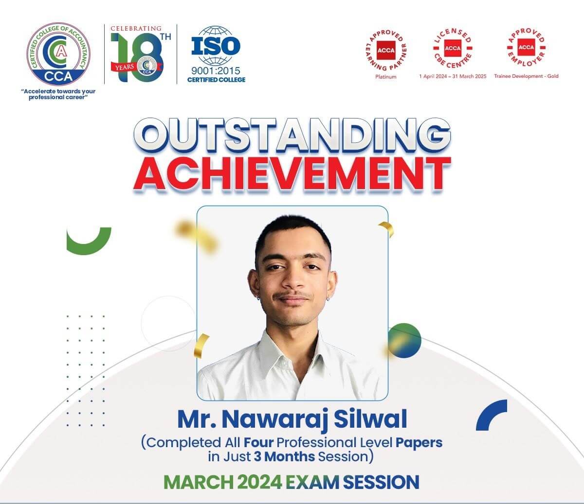 In a remarkable display of dedication and academic prowess, Mr. Nawaraj Silwal has accomplished a feat that stands as a testament to his commitment to excellence. Completing all Professional Level Papers of the Association of Chartered Certified Accountants (ACCA) within a mere 3-month period, Mr. Silwal's achievement is nothing short of extraordinary.