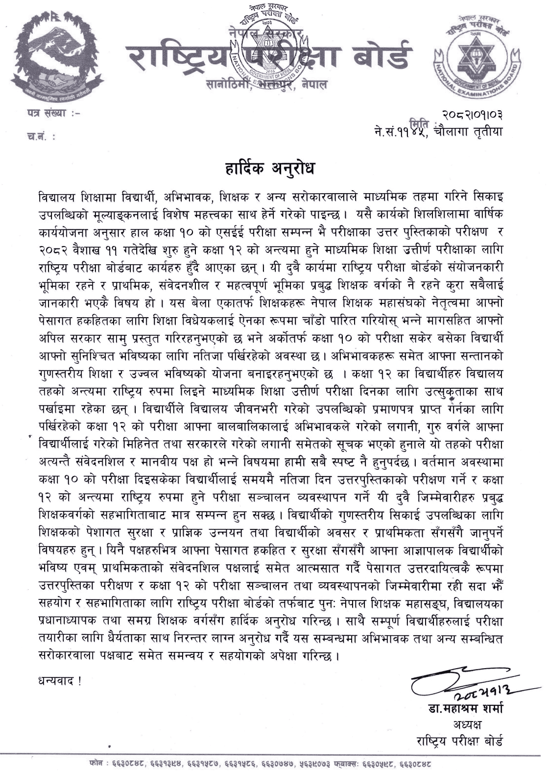In line with the annual schedule, the Class 10 SEE examination has been completed. Work is underway for the examination of answer sheets. Preparations are also ongoing for the Class 12 final secondary education examination, commencing on Baisakh 11, 2082.