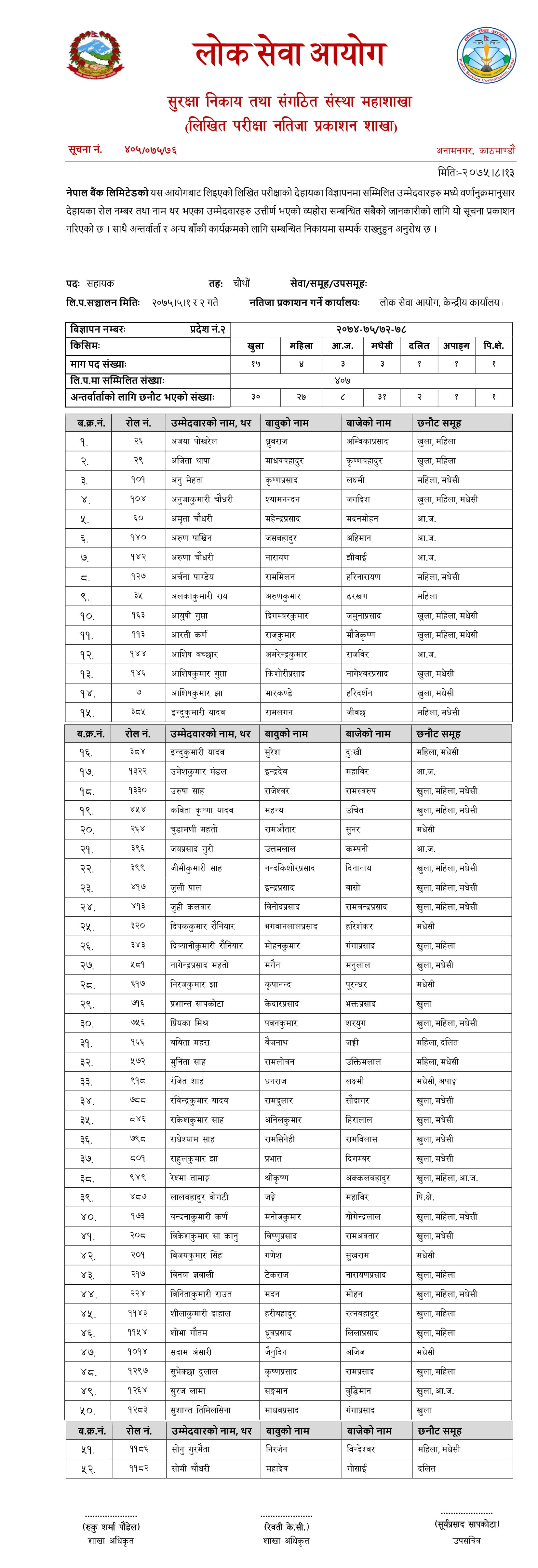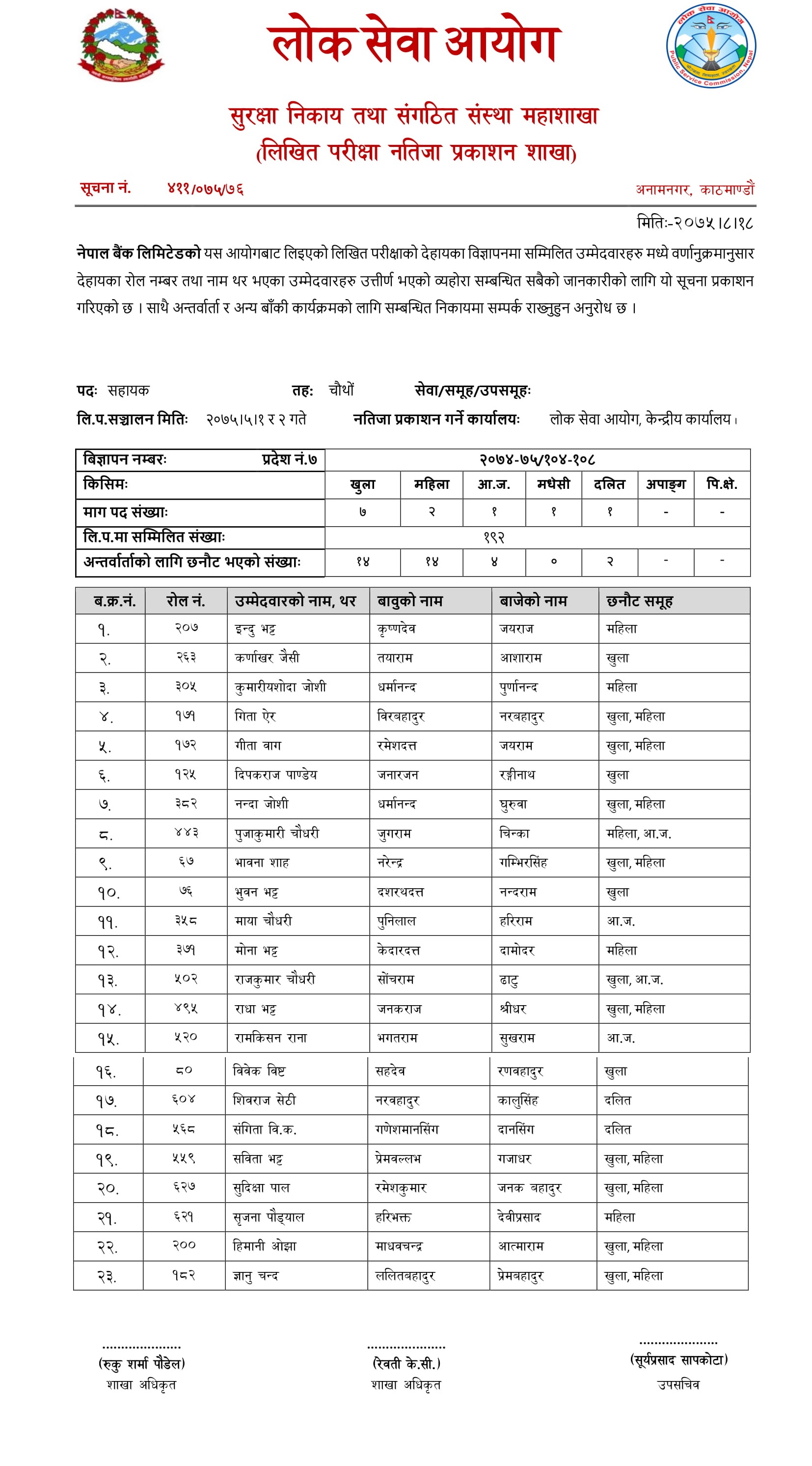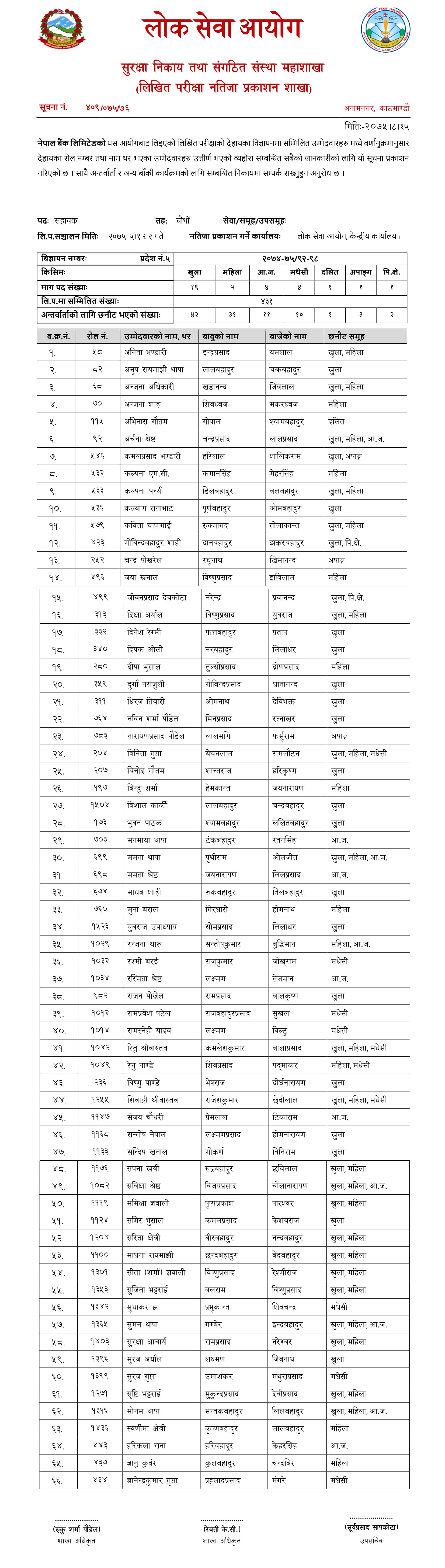 Lok Sewa Aayog Published Nepal Bank Limited Assistant Level 4 Written Exam Result