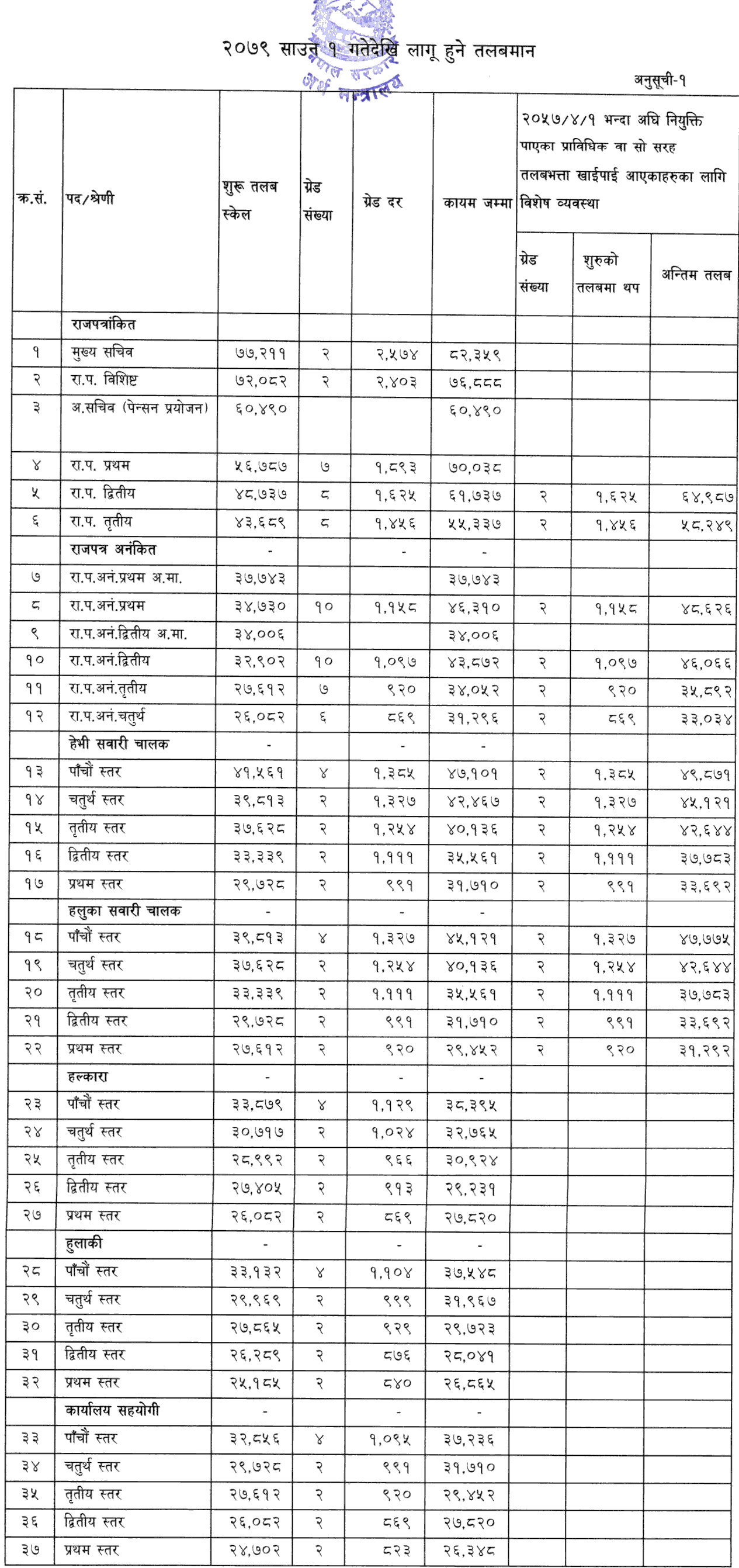 According to the decision of the Council of Ministers, it has been informed that a new salary scale and grade will be approved for all levels of civil servants, Nepali Army, Nepal Police, Armed Police Force, Nepal Health Service, Parliament Service, teachers working in public schools, effective from 1st Shrawan 2079.
