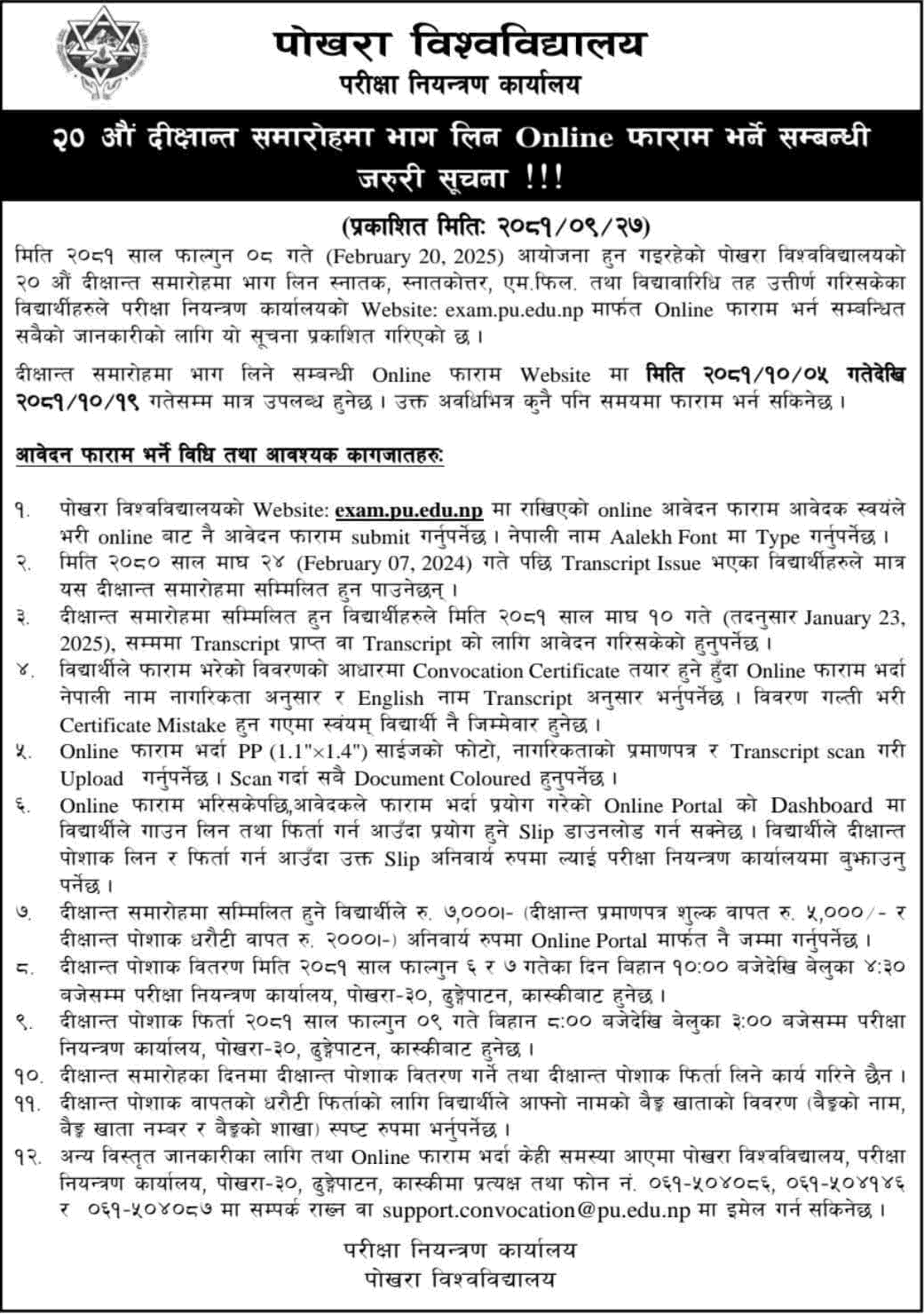 This notice is published for the information of all concerned that students who have already graduated with Bachelor’s, Master’s, M.Phil., and Ph.D. degrees and wish to take part in Pokhara University’s 20th Convocation Ceremony—scheduled for Falgun 08, 2081 (February 20, 2025)—must fill out the online form via the Office of the Controller of Examinations’ website: exam.pu.edu.np.