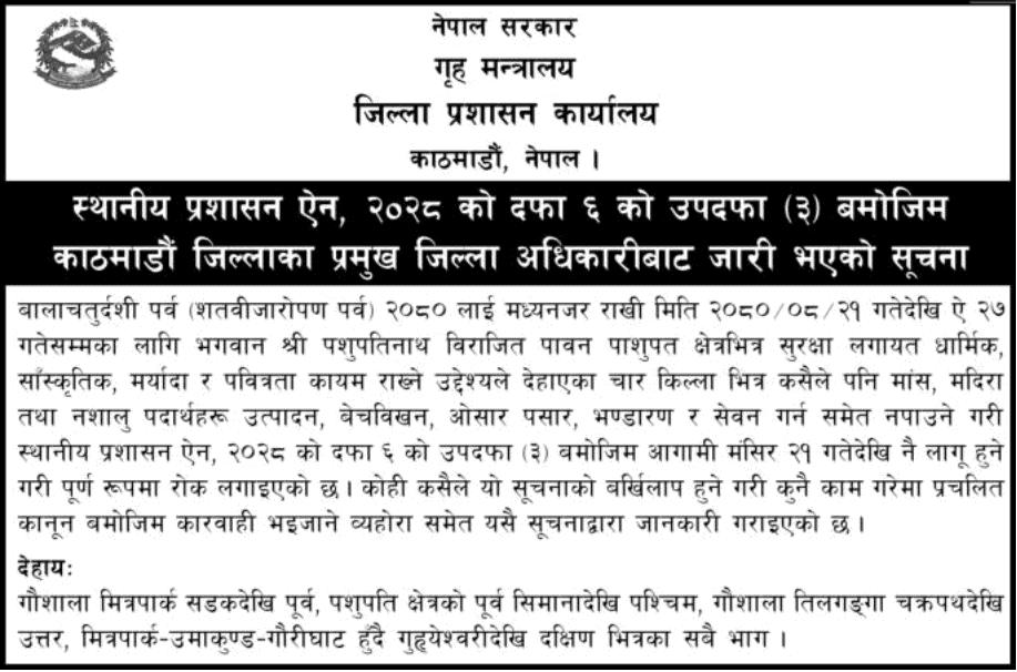 - The restriction zone encompasses the east of Gaushala Mitrapark road, the eastern border of the Pashupati area to the west, north of the Gaushala Tilganga ring road, and the south region stretching from Mitrapark-Umakunda-Gaurighat to Guhyeshwari.