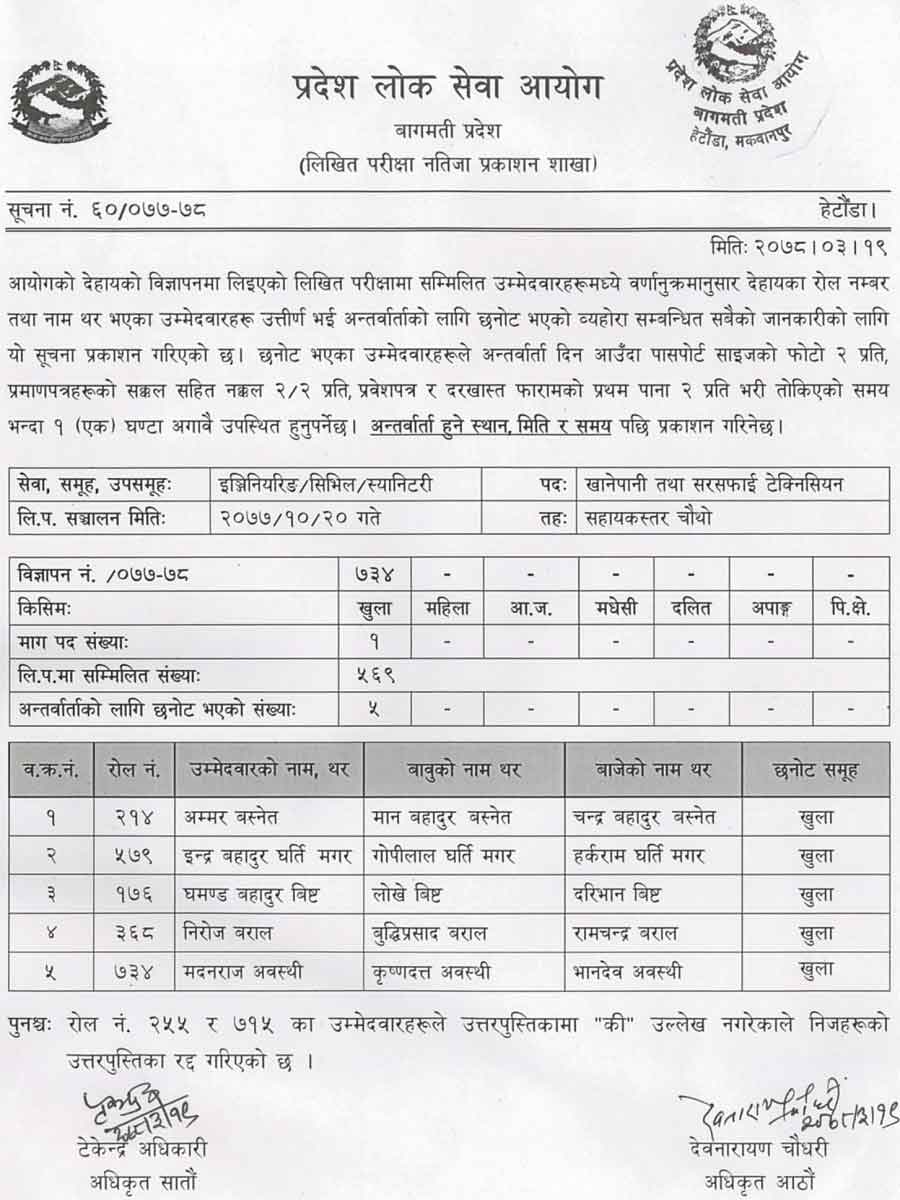Province Public Service Commission Bagmati Pradesh (Bagmati Pradesh Lok Sewa Aayog) Published Result of Engineering Service, Civil Group, Sanitary Subgroup, Kha Pa Sa Te Post, Fourth Level First Phase Written Examination.