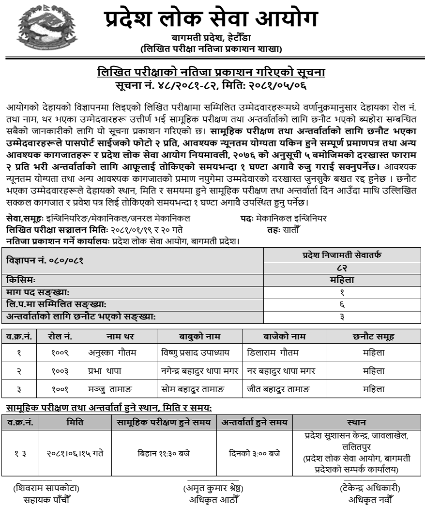 Provincial Public Service Commission, Bagmati Province (PPSC Bagmati), Hetauda Notice Regarding the Publication of Written Examination Results for Advertisement No. 82/080-81 (Female) for Mechanical Engineering Service, General Mechanical Sub-group, Seventh Level, Mechanical Engineer Position