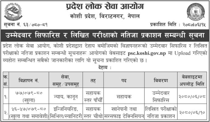 The Province Public Service Commission of Koshi Pradesh is pleased to inform all stakeholders and interested parties about the recent updates concerning candidate recommendations and the publication of written exam results. All detailed information can be accessed on the official commission's website: http://psc.koshi.gov.np.