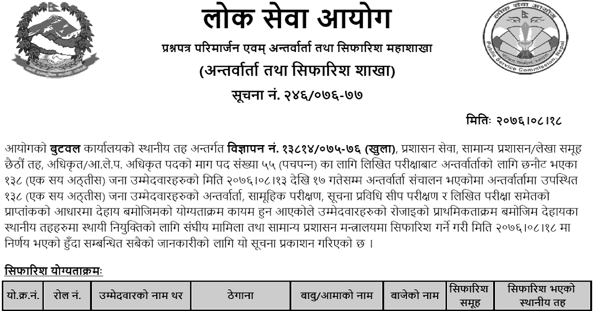 Lok Sewa Aayog Butwal, Local Level 6th Level Officer Final Result and Recommendations