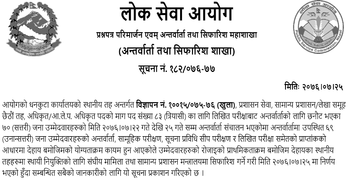Since the qualification of the following procedure is maintained on the basis of the scores obtained by the examinations, this information has been published for the information of all concerned as it was decided on the date of 2076/07/25 to recommend to the Ministry of Federal Affairs and General Administration for permanent appointment at the local level of the candidates according to their preference.