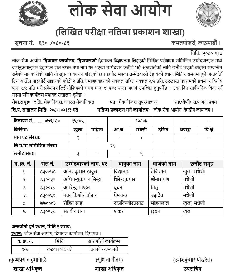 The Public Service Commission (PSC - Lok Sewa Aayog), Dipayal Office, has released an important notice regarding the interview schedule for the position of Mechanical Supervisor in the Engineering Service, Mechanical Group, General Mechanical Sub-Group. This follows the written examination conducted as per Advertisement Nos. 15805-15806/079-80.