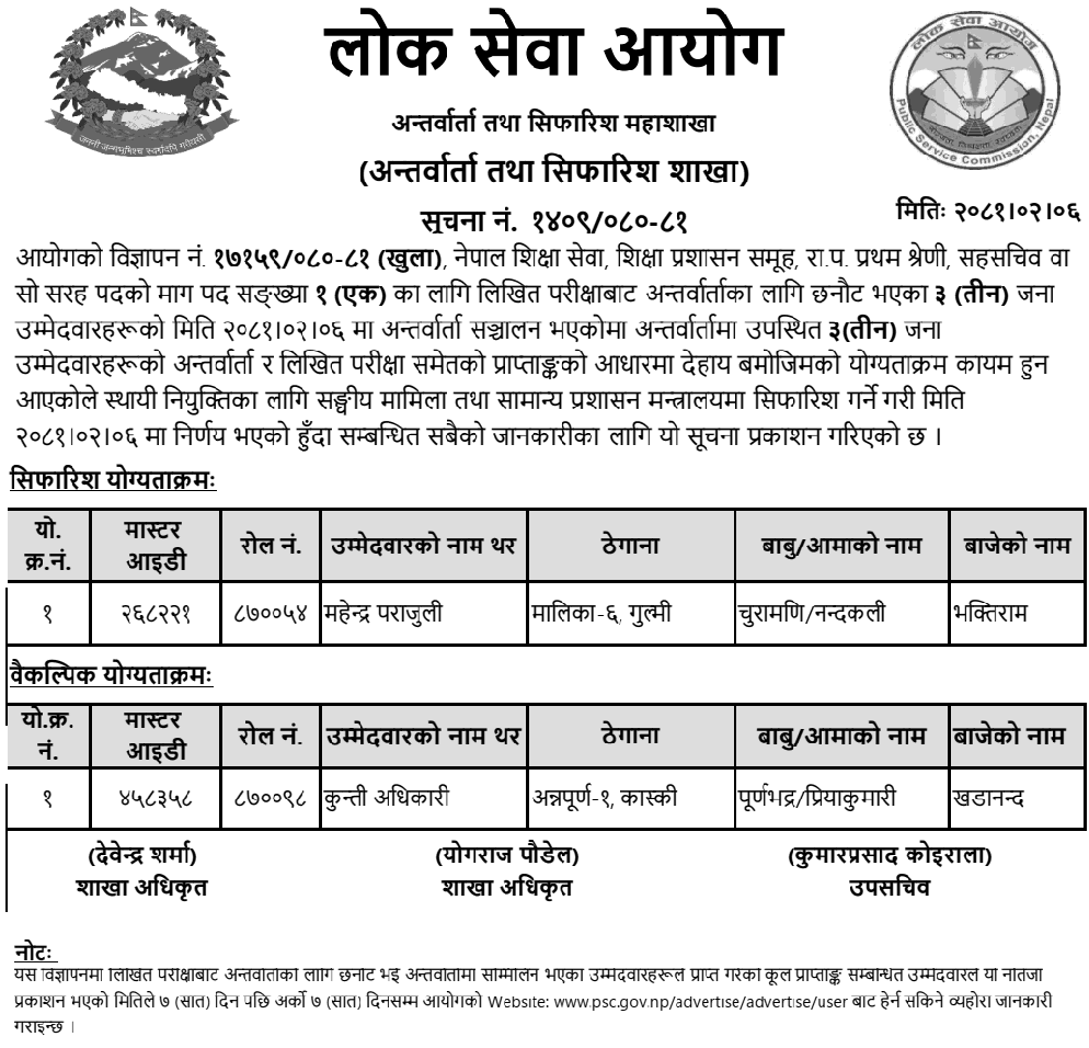 Public Service Commission Advertisement No. 17159/080-81 (Open), Nepal Education Service, Education Administration Group, Gazetted 1st Class, Joint Secretary or equivalent post demand for post number 1 (one) of 3 (three) candidates selected for interview through written examination Date 2081/ Since the interview was conducted on 02/06, based on the scores of the 3 (three) candidates present in the interview and the written test, the following merit order has been established, and it has been decided on 2081/02/06 to recommend to the Ministry of Federal Affairs and General Administration for permanent appointment. This notice is published for the information of all concerned.