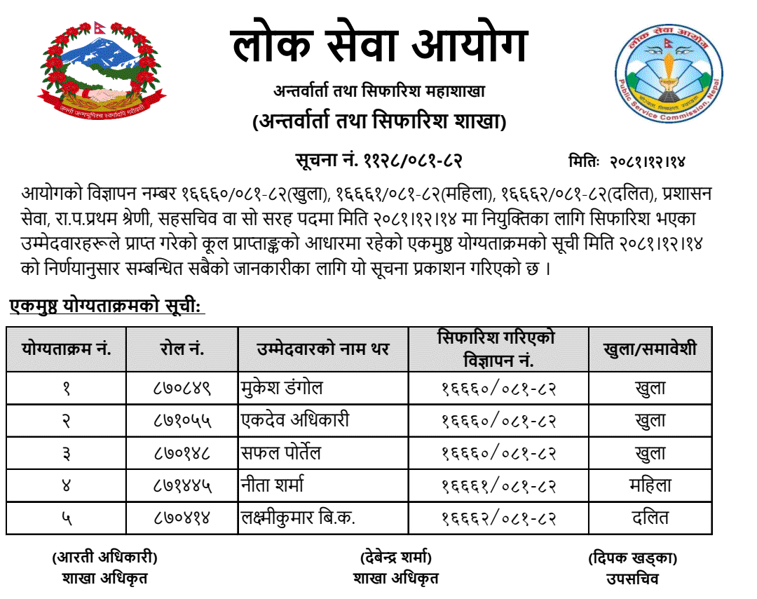 According to the decision made on 2081/12/14, the list of recommended candidates for appointment under advertisement numbers: