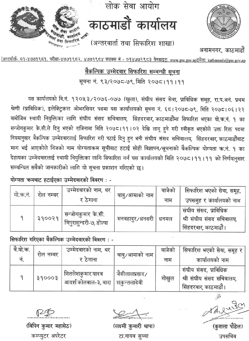 Public Service Commission, Kathmandu Office Advertisement No. 12053 / 2076-077 (Open), Federal Parliament Service, Technical Group, Non-Gazetted First Class (Technical), Alternate Candidate Recommendation for Electrical Overseer Post