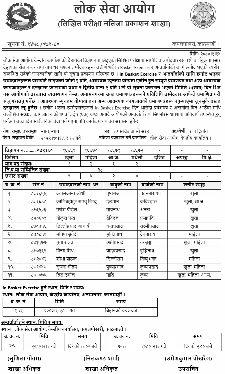 Lok Sewa Aayog Written Exam Result of Upa Sachiv (Judicial Service): Public Service Commission, Central Office Advertisement No. 16675-16677/079-80 (Open/Inclusive), Judicial Service, Government Lawyer Group, Upa Sachiv or Similar Posts Written Result