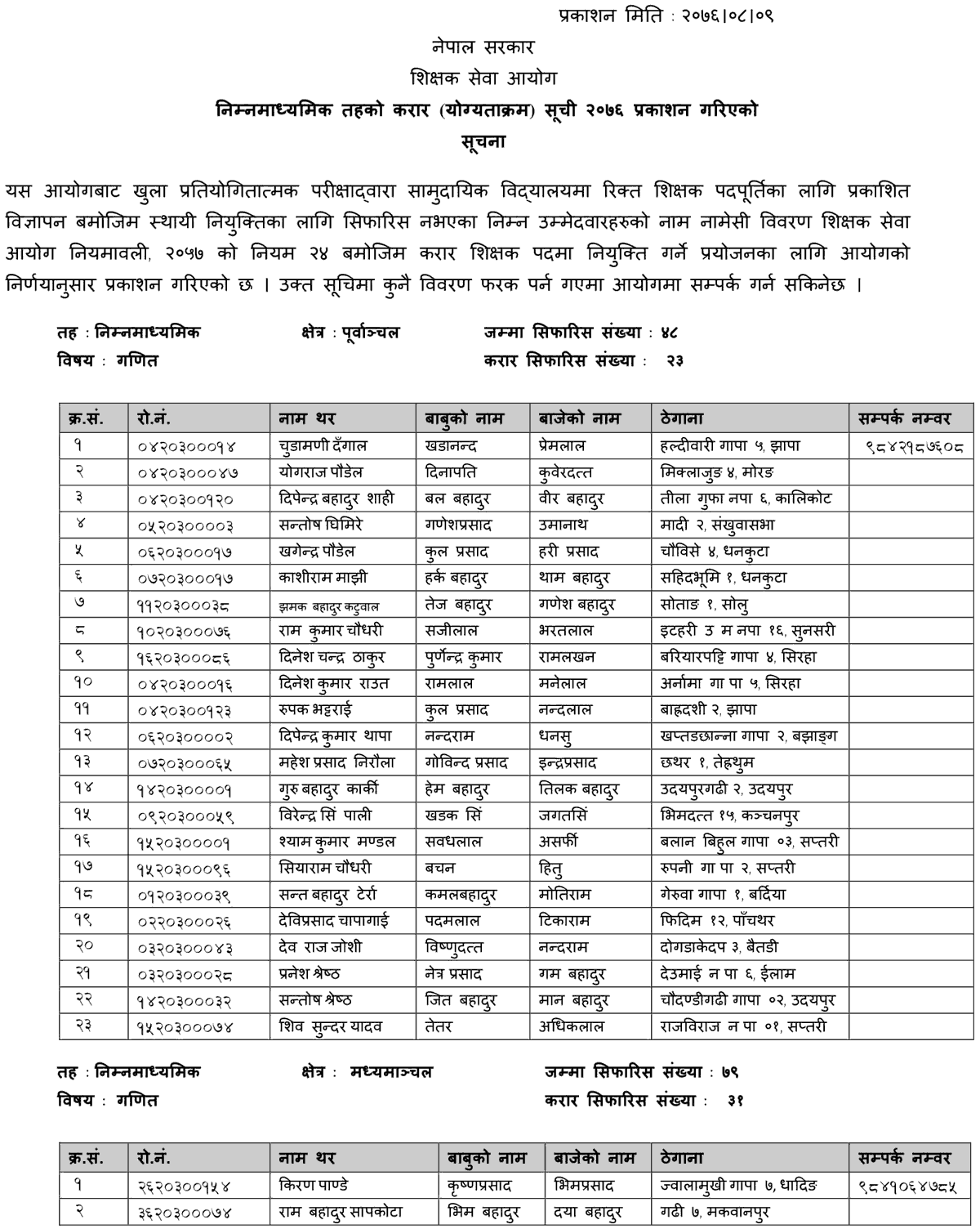 According to the decision of the Commission, for the purpose of appointing the contract teacher in accordance with Rule 24 of the Teachers Service Commission Rules, 2057, the names of the following candidates, which are not recommended for permanent appointment as per the advertisement published for the vacancy of vacant teacher in the community schools, have been published by the open competition examination from the Teacher Services Commission. The Commission can be contacted if any details on this list differ.