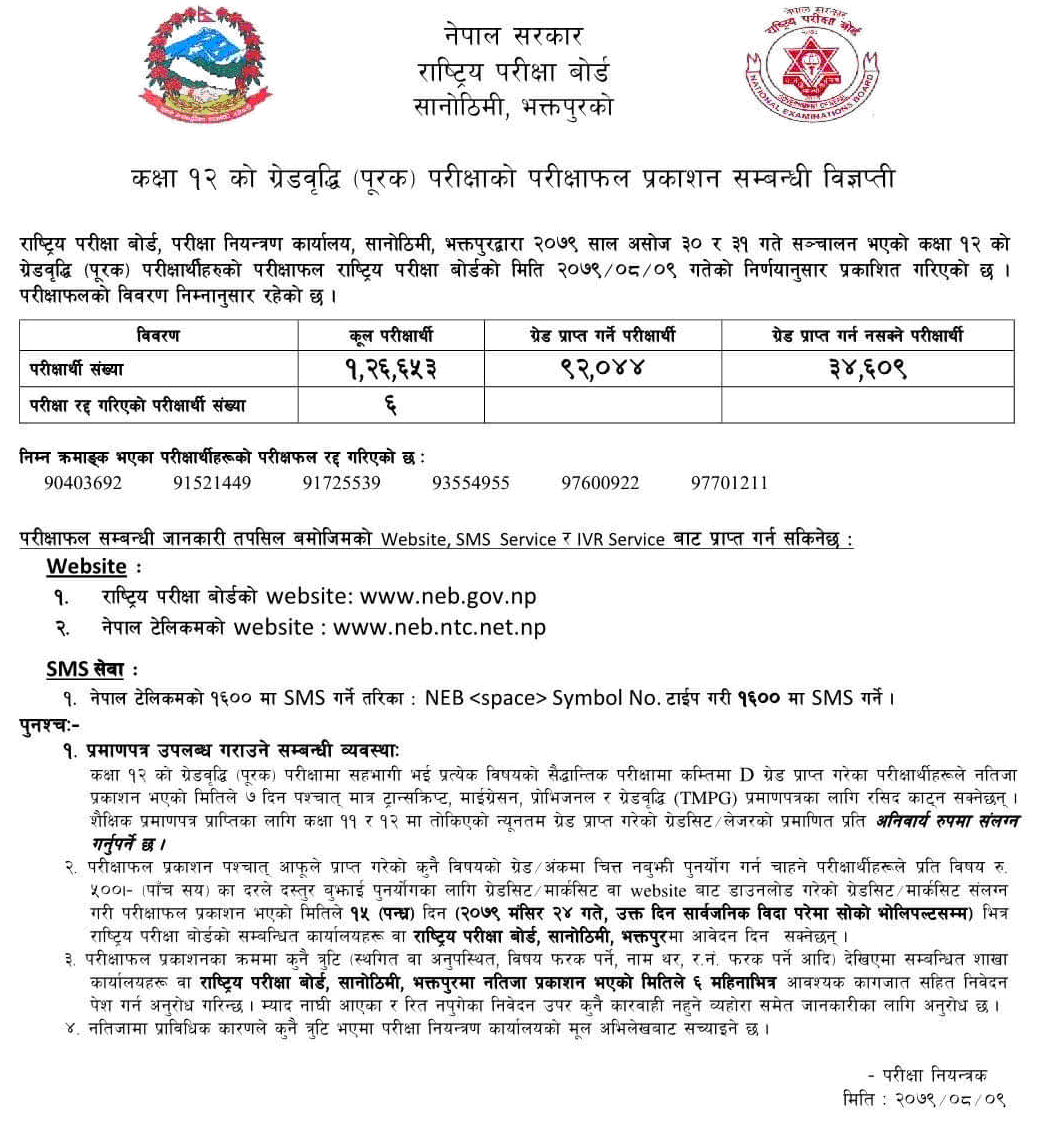 National Examination Board, Examination Control Office, Sanothimi, Bhaktapur conducted on 30th and 31st October 2079, the results of Grade 12 Grade Increment (supplementary) examinees have been published as per the decision of National Examination Board dated 06/09/2079. The details of the exam results are as follows.