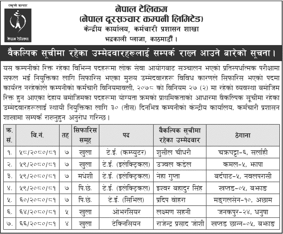 Nepal Telecom (Nepal Doorsanchar Company Limited), Central Office, Employee Administration Branch, Bhadra Kali Plaza, Kathmandu, publishes the following urgent notice regarding candidates listed on the alternative list.