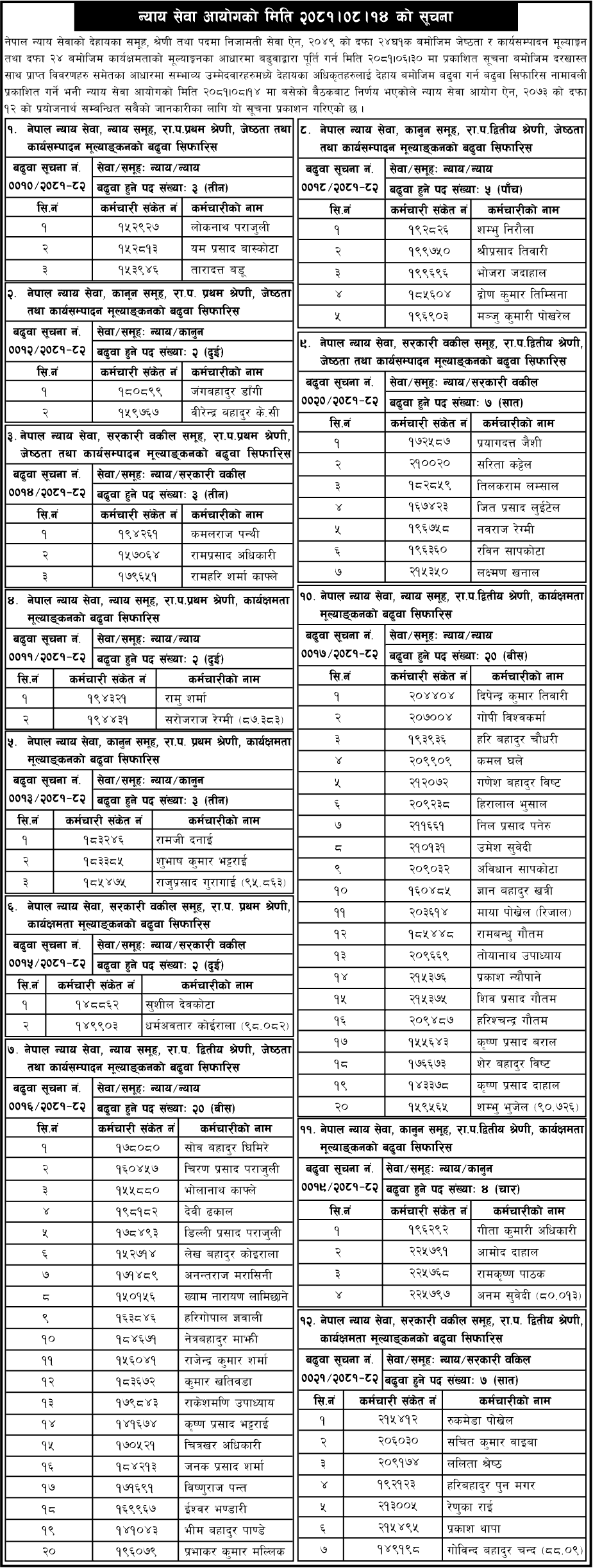 The Judicial Service Commission (Nyaya Sewa Aayog) has published promotion recommendations based on seniority, performance evaluations, and competency assessments per Clause 24 (1a) and 24 of the Civil Service Act, 2049. This decision was made during the commission's meeting on 2081/08/14.