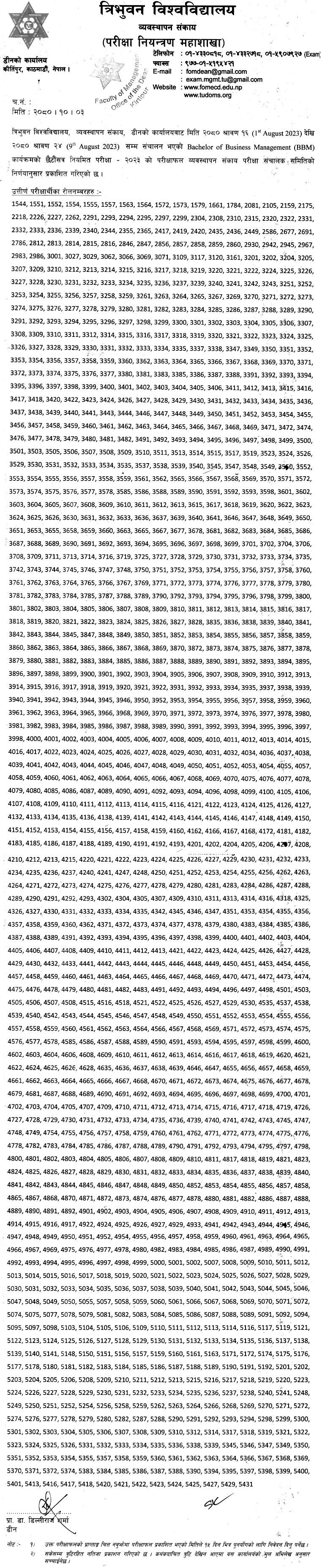 - Examination Period: The BBM Sixth Semester Regular Examination 2023 was conducted from August 1, 2023 (Shrawan 16, 2080) to August 9, 2023 (Shrawan 24, 2080).