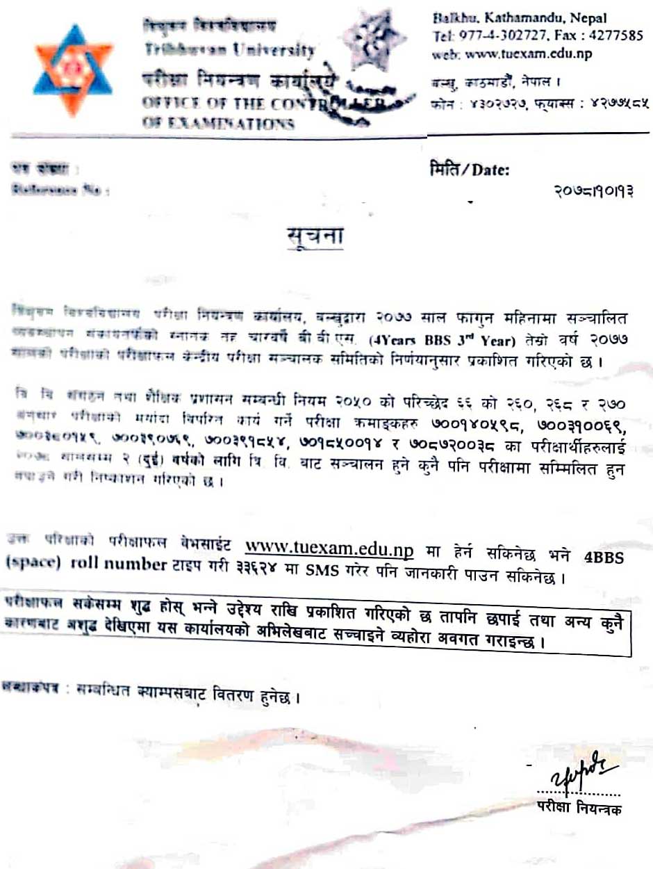 The results of the exam can be viewed on the website www.tuexam.edu.np or by typing the 4BBS (Space) roll number and sending an SMS to 33624.