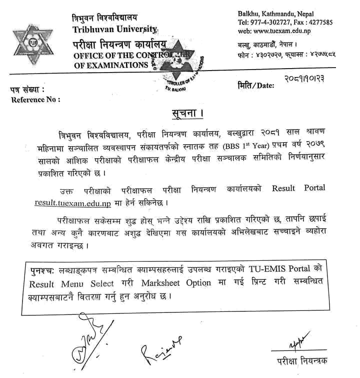 The results of the partial examination of the Bachelor of Science (BBS 1st Year) 1st Year 2079 BS conducted by the Office of the Controller of Examinations, Tribhuvan University, Balkhu, in the month of Shravan 2081 BS have been published as per the decision of the Central Examination Board.
