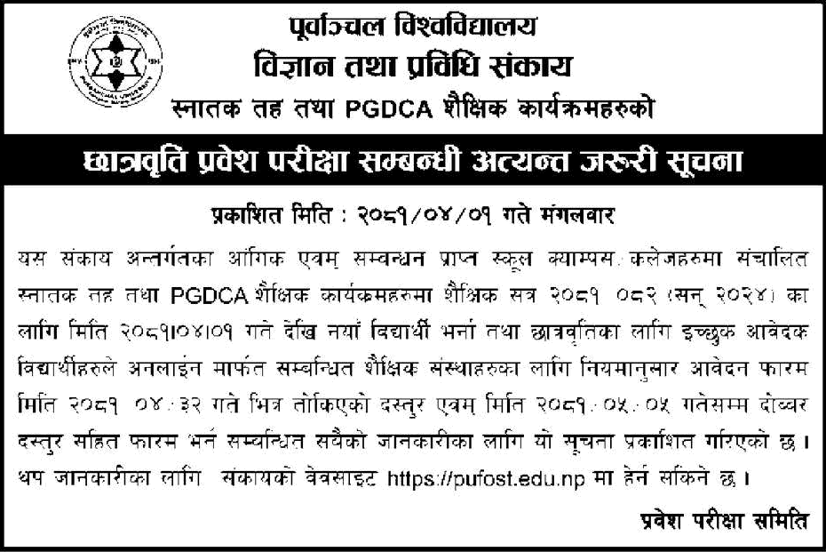 Purbanchal University, Faculty of Science and Technology Urgent Notice Regarding Scholarship Entrance Examination for Bachelor’s Level and PGDCA Educational Programs