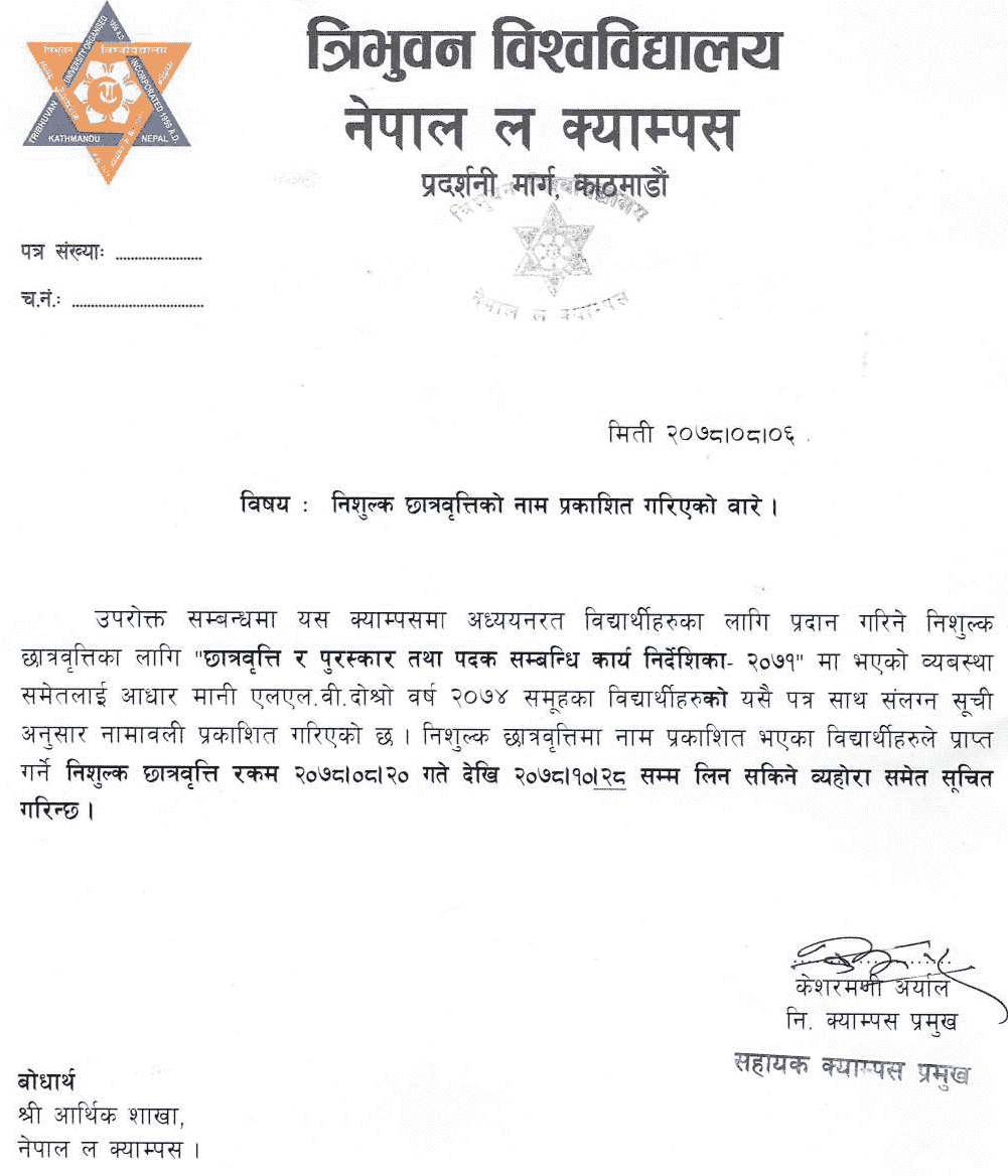 Tribhuvan University, Nepal Law Campus, Exhibition-Marg-Kathmandu name list of the free scholarship for LLB Second Year. In this regard, the list of students of LLB 2nd year 2074 group has been published as per the attached list along with this letter based on the provision made in "Working Scholarship on Scholarships and Awards and Medals 2071" for free scholarships to be provided to the students studying in this campus.
