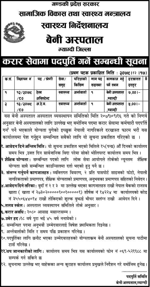 The Ministry of Social Development and Health, Directorate of Health, Beni Hospital, Myagdi has published a notification for appointment to contract service. The notice is aimed at eligible Nepali citizens who wish to apply for the positions of Health Assistant (HA) -1 and AHW - 1 at Beni Hospital.