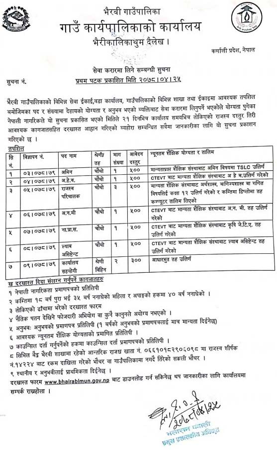 Since the various service units of Bhairabi Rural Municipality, Ward Office, various branches of Rural Municipality have to take the required details in the service contract from the person with the following qualifications and experience in the required posts and numbers. This notice has been published for the information of all those who have applied for the application along with the required documents within 21 days from the date of publication of this information.